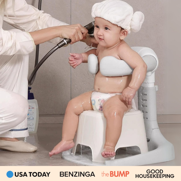 Standee™ lets your baby stand comfortably and securely while you wash them, hands-free, stress-free, pain-free.