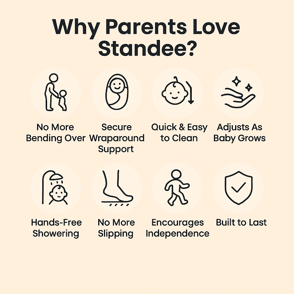 Make bath time easier with Standee™, the ergonomic standing shower support trusted by parents and designed by infant care specialists to promote healthy posture, reduce bath-time stress, and provide a safer, more soothing experience as your child grows.